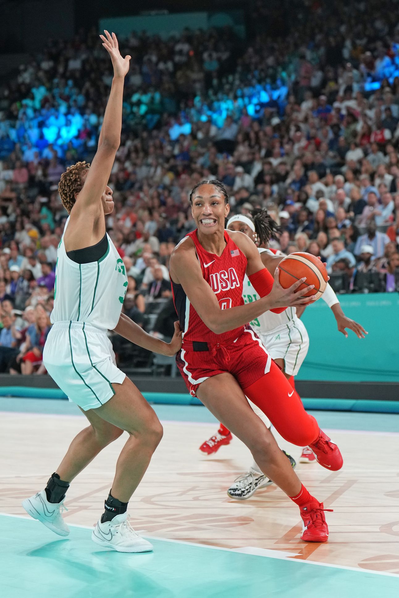 A’ja Wilson driving to the basket against Nigeria in the 2024 Olympic Quarterfinals. Photo Credit: USA Basketball